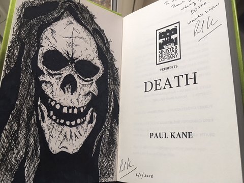 Above and below you’ll find pictures of a new remarque Paul did last month for a client in a hardback copy of Death. To visit the page for this service on the SW site and arrange your own, just click here.